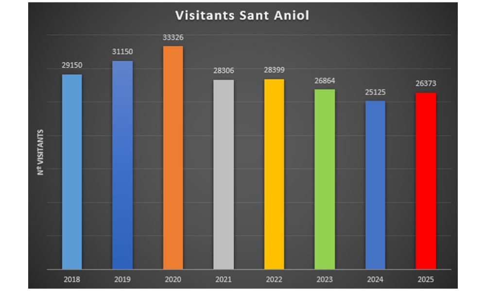 Pel que fa a la freqüentació a la vall de Sant Aniol, durant el 2025 s’ha trencat la tendència descendent en el nombre de visitants detectats els 3 anys anteriors. En concret les dades totals de 2025 mostren un augment respecte al 2024 d’un 5%, on el total anual passa de 25.125 visitants el 2024 a 26.373 el 2025.